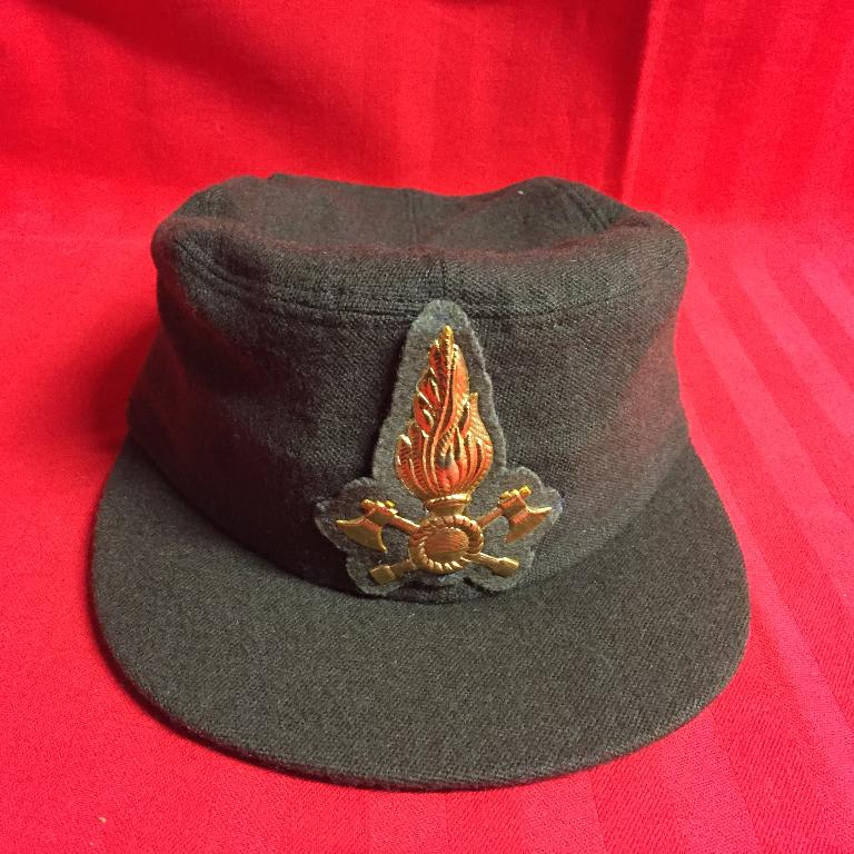 Berretto in panno con visiera in panno, divisa invernale, stemma ricamato in oro, fascia interna in pelle, fodera in stoffa, stampa all'interno "BERRETTIFICIO PIEMONTESE", misura 55