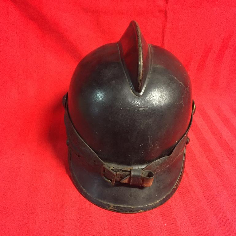 Elmo in cuoio verniciato nero, visiera e paranuca in cuoio, cresta e finiture in lamiera dipinta nero, borchie in ottone scurito con testine di leone, marocchino in cuoio (mancano i lacci), sottogola in cuoio