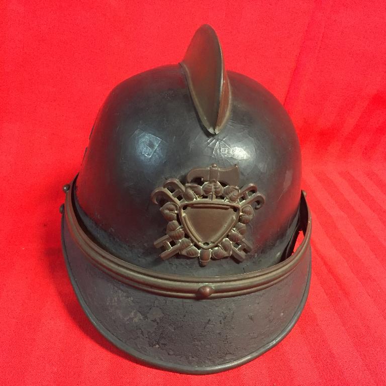 Elmo in cuoio dipinto nero, con visiera e paranuca in metallo dipinto, cresta e fascetta intorno all'elmo in rame (forse dorato), stemma in rame formato da uno scudo triangolare, senza placca interna, corona di foglie di gelso (simbolo della prudenza in araldica), ascia e scale, fori aerazione, marocchino in cuoio con lacci, sottogola in cuoio