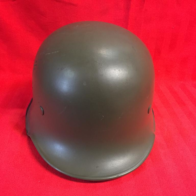 Elmo da incendio tedesco, in ferro dipinto verde militare, fori aerazione, marocchino in cuoio con lacci, imbottitura interna, sottogola in cuoio, paracollo in cuoio, misura 55. Sembra non essere mai stato usato