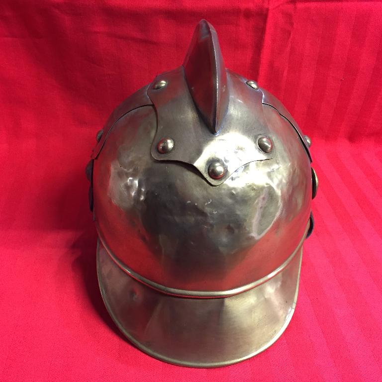Elmo in ottone mod. austriaco, con cresta in ottone applicata con borchie, rinforzo perpendicolare in lamiera di ottone, borchie con teste di leone a reggere il sottogola, visiera e paranuca applicati, marocchino in cuoio con lacci, sottogola in cuoio