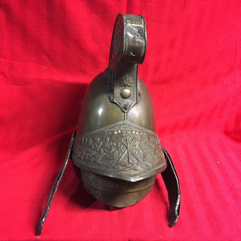 Elmo da parata in ottone, probabilmente francese, con cresta dorata a sbalzo, avvitata, visiera decorata a sbalzo, mobile, soggolo decorato a scaglie di pesce, con rosette di ottone, foderato in cuoio, visiera foderata in cuoio, decorazione con rami e foglie di quercia a sbalzo tutt'attorno all'elmo, soggolo e visiera avvitati, un foro centrale sopra la visiera fa pensare ad uno stemma mancante, ed altri fori laterali alla stessa altezza