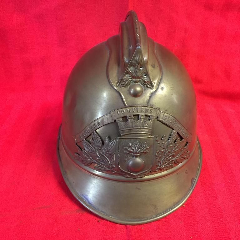 Elmo in ottone con stemma "Sapeurs Pompiers d'Heidwiller" (comune francese dell'alto Reno, Grand Est), cresta avvitata, visiera e paranuca in un unico pezzo applicato, marocchino in cuoio con lacci, sottogola in cuoio