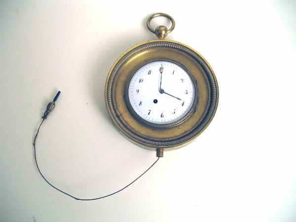 Cassa circolare in ottone, pendente sferico con anello circolare.\nQuadrante in smalto bianco, indicazione delle ore in cifre arabe, lancette a lancia.\nMovimento di orologio da tasca adattato alla tipologia da capezzale, con platina intera con colonnini cilindrici. Conoide a catena, scappamento a verga, ponte del bilanciere a due piedi, traforato e inciso, con controperno in acciaio. Carica anteriore a chiavetta. Ripetizione ore e quarti a richiesta, tramite cordicella.