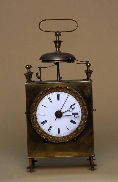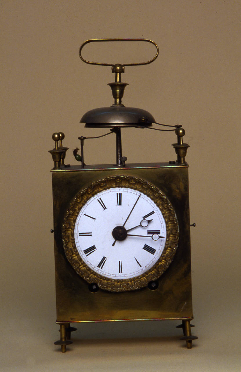 Cassa in ottone con sportelli sui fianchi e sul retro, pinnacoli e piedini ad anforetti a trottola.\nQuadrante in smalto bianco con indicazione delle ore in numeri romani. Lancette a occhio per le ore e i minuti, indice filiforme per il puntamento manuale della sveglia. La mostra è circondata da una cornice decorata.\nMovimento a platina rettangolare con scappamento a cilindro regolato da un blianciere a spirale. Carica anteriore a chiavetta per il tempo e per la suoneria ore e quarti su due campanelli. Carica della sveglia a tiraggio con cordina. Maniglia per la presa.