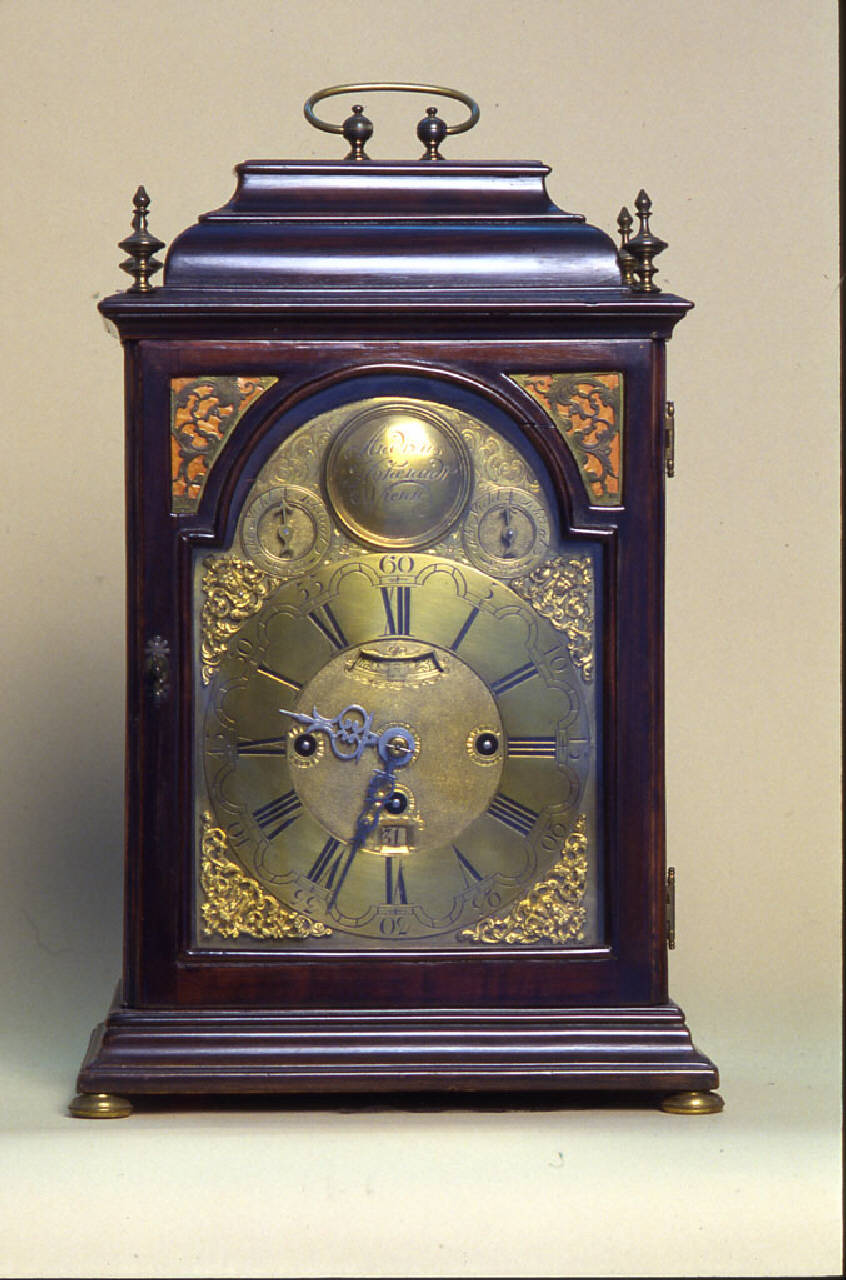 Cassa all'inglese in legno ebanizzato.\nQuadrante con lunetta e firma dell'autore nel cartiglio al centro. Due quadranti ausiliari per la regolazione della suoneria "suona-non suona" (schlagt-schl. nicht). Fregi agli angoli. Indicazione delle ore in caratteri romani, e dei minuti in cifre arabe di cinque in cinque. Finestrelle per il finto pendolo, rappresentante un piccolo sole, e per il calendario.\nMovimento con scappamento a verga regolato da pendolo. Carica anteriore per il tempo, per la suoneria delle ore e i quarti e per la sveglia. Sveglia a tiraggio. Suoneria ore e quarti anche a richesta.