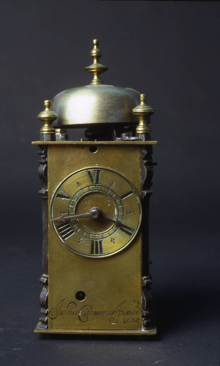 Cassa in ottone con montanti in ferro disposti diagonalmente e con modanature sopra e sotto. Sportelli in ottone liscio per l'ispezione del movimento.\nQuadrante in 6, quadrantino posteriore per il controllo della suoneria.\nMovimento a due treni contrapposti. Treno del tempo con conoide a budello. Scappamento a verga con pendolino sul retro, originariamente "a coda di vacca", davanti alla mostra. Treno della suoneria con bariletto fisso.