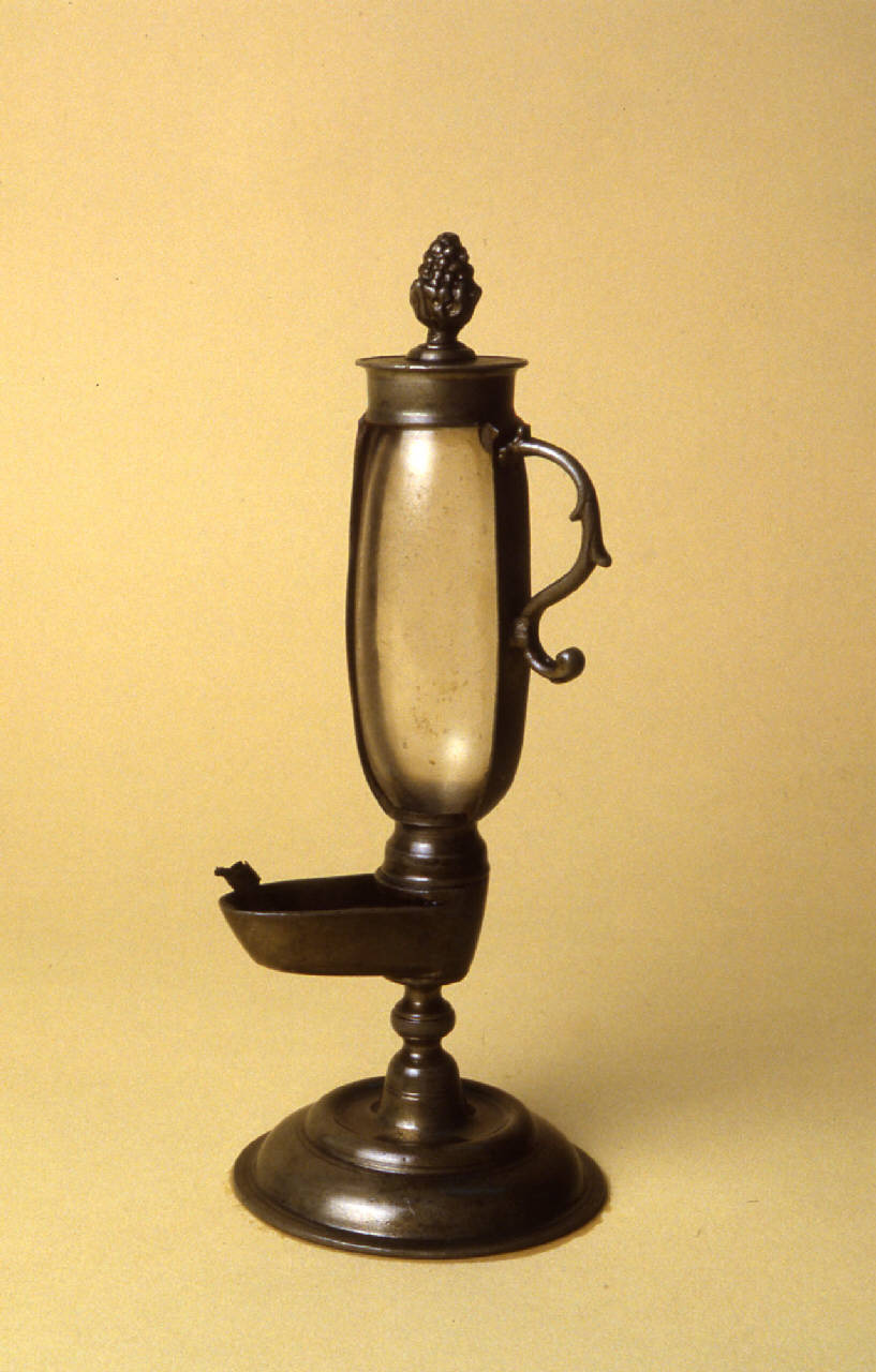 Orologio ad olio con recipiente in vetro e indicazione delle ore in numeri romani. Pigna decorativa sulla sommità dell'ampolla. Base circolare e piedistallo corto. Impugnatura per il trasporto in alto sul fianco dell'ampolla.