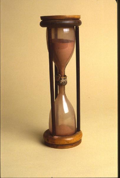 Orologio a sabbia con montatura in legno a tre pilastri cilindrici.