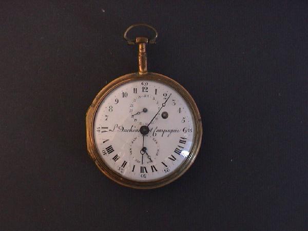 Cassa in ottone in due parti: carrure e lunetta portavetro. Pendente a disco con anello ovale fissato con vite.\nQuadrante in smalto bianco con indicazione delle 24 ore, di cui le 12 diurne in cifre arabe e le 12 notturne in cifre romane. Indicazione dei minuti di cinque in cinque, dai 15 ai 45, in cifre arabe. Due quadrantini, uno in basso, per l'indicazione del giorno della settimana, uno in alto per l'indicazione del giorno del mese. Apertura per la carica del tempo a ore 3. Sfere Breguet.\nMovimento a platina intera con colonnini cilindrici. Ponte bilanciere traforato e inciso a due piedi con controperno in acciaio. Conoide a catena, scappamento a verga e regolazione del tempo a chiavetta. Bilanciere monometallico in ottone a tre razze. Carica a chiavetta dal quadrante.