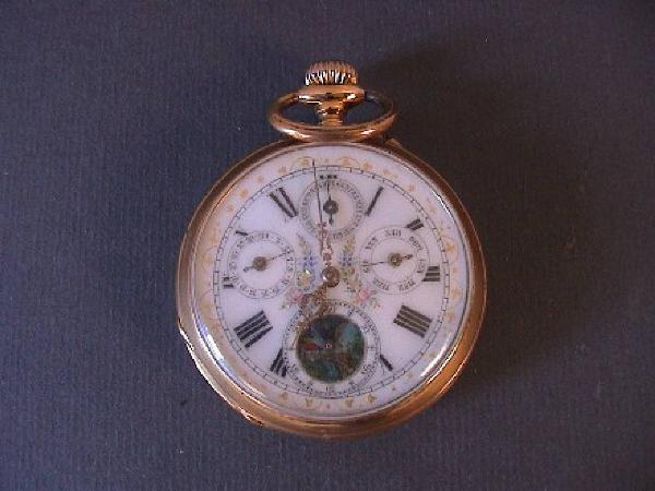 Cassa in oro liscia, costruita in quattro parti: carrure, cuvette, fondello e lunetta portavetro. Pendente a oliva con collo conico, anello ovale inserito a pressione, corona di carica.\nQuadrante in smalto bianco con indicazione delle ore in numeri romani. Quadrantino a ore 12 per l'indicazione del mese. Quadrantino a ore 3 per l'indicazione del giorno della settimana. Quadrantino a ore 6 con l'indicazione dei secondi e apertura all'interno per le fasi lunari. Quadrantino a ore 9 per l'indicazione del giorno del mese. Lancette delle ore stile Luigi XVI, lancette per l'indicazione del calendario e dei secondi filiformi.\nMovimento a ponti separati. Scappamento ad ancora, 22 rubini, bilanciere bimetallico compensato con viti di regolazione. Regolazione del tempo a chiavetta su settore graduato. Carica e messa all'ora tramite corona.