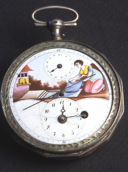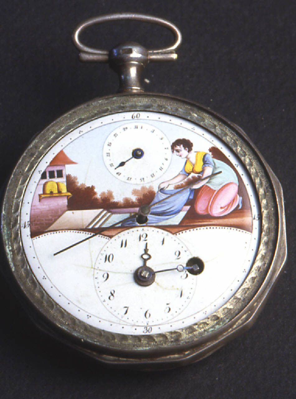 Cassa liscia in due parti: fondo e lunetta portavetro con bordo poligonale a dodici lati. Pendente a disco con collo cilindrico sagomato e anello ovale spinato.\nQuadrante decorato con quadrantino nella parte bassa per l'indicazione delle ore e dei minuti con cifre arabe. Secondi al centro con indicazione di quinidci in quindici in cifre arabe. Nella parte superiore un quadrantino per l'indicazione del giorno del mese. Lancette Breguet per le ore e i minuti, lancetta filiforme per i secondi, lancetta a pera per il calendario.\nMovimento a platina intera con colonnini cilindrici. Conoide a catena. Scappamento a verga. Ponte bilanciere a due piedi traforato e inciso con controperno in acciaio. Regolazione del tempo a chiavetta su quadrantino. Carica anteriore a chiavetta.