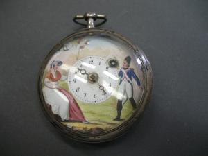 Cassa in due parti: fondo liscio e lunetta portavetro. Pendente a disco con collo cilindrico e anello ovale spinato.\nQuadrante in smalto dipinto con figura di soldato napoleonico alla destra della mostra e figura femminile alla sinistra. Indicazione delle ore e dei minuti su quadrantino centrale con indicazione delle ore in cifre arabe verticali. Lancette delle ore e dei minuti breguet.\nMovimento a platina intera con colonnini a sezione quadrata scanalati. Conoide a catena. Scappamento a verga. Ponte bilanciere a due piedi, traforato e inciso con controperno in acciaio. Regolazione del tempo su quadrantino. Carica anteriore a chiavetta.