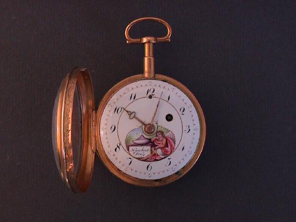 Cassa in due parti: fondo liscio e lunetta portavetro entrambi con decorazione floreale incisa sul bordo. Pendente a disco con lungo collo cilindrico a pressione per l'attivazione della ripetizione e anello ovale spinato.\nQuadrante in smalto bianco con indicazione delle ore in cifre arabe. Apertura per la carica. Lancetta traforata per le ore e filiforme per i minuti.\nMovimento a platina intera con colonnini cilindrici. Conoide a catena. Scappamento a verga. Ponte bilanciere traforato e inciso a due pidei con controperno in acciaio. Regolazione del tempo a chiavetta su quadrantino. Carica a chiavetta anteriore. Ripetizione con due martelli su campanella. Copripolevere incernierato sul movimento.