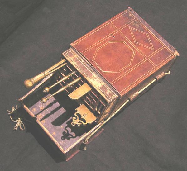 L'astuccio è costituito da una scatola a forma di parallelepipedo con i tre assi di diversa lunghezza. La base è formata dal piano definito dai due assi minori mentre l'altezza è rappresentata dall'asse più lungo. La scatola è chiusa da un coperchio trattenuto da un cordino; è di legno ricoperta di cuoio e finemente lavorata all'esterno con fregi forse in oro. \nAl suo interno, per mezzo di una serie di divisori, sono ricavati alcuni scomparti ognuno dei quali destinato a contenere un diverso strumento per il disegno tecnico. Attualmente ne sono presenti undici, tutti in ottone e in buone condizioni. Molti di questi sono lavorati con estrema cura anche dal punto di vista estetico oltre che funzionale. Alcuni sono destinati alla misurazione di separazioni angolari, altri alla determinazione di distanze lineari, altri ancora al calcolo veloce di rapporti di scala.