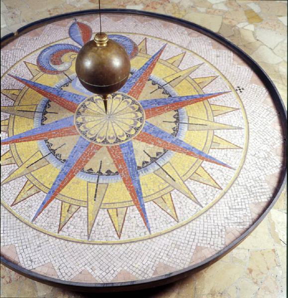 Una sfera di piombo ricoperta di ferro è sospesa al soffitto per mezzo di un lungo cavo di acciaio. Il cavo si aggancia alla soletta per mezzo di uno snodo cardanico che ne consente la libera oscillazione in tutte le direzioni (attriti permettendo). Nella parte inferiore della sfera è avvitato un puntale che però è di lunghezza tale da non toccare il pavimento. Sul pavimento, esattamente sotto al pendolo e perfettamente centrato rispetto al punto di sospensione, è posizionato un disco di grande dimensioni realizzato a mosaico con tessere variamente colorate raffiguranti la rosa dei venti.\nIl pendolo può essere messo in oscillazione (da un operatore autorizzato) per dimostrare il fenomeno della rotazione terrestre.