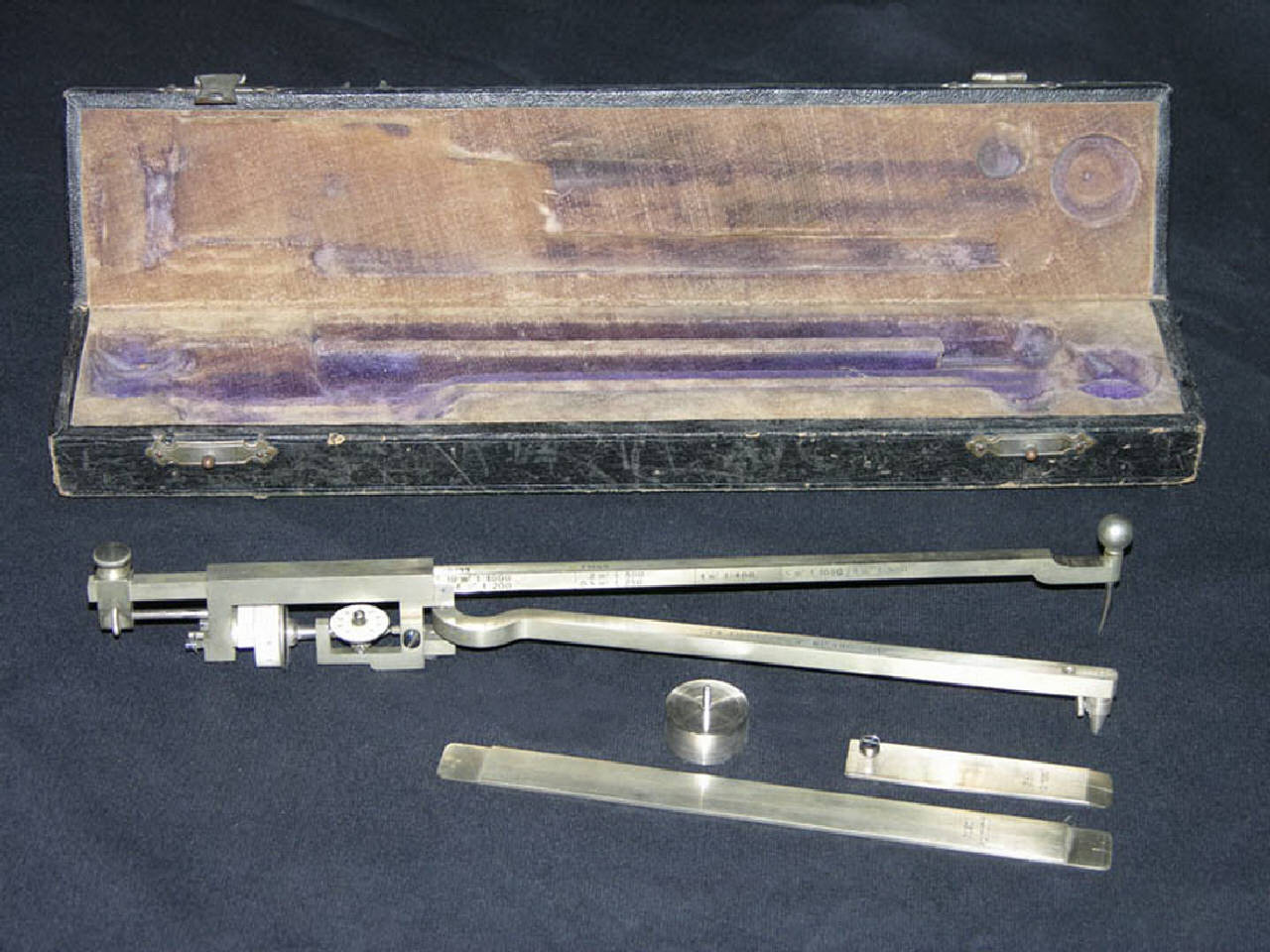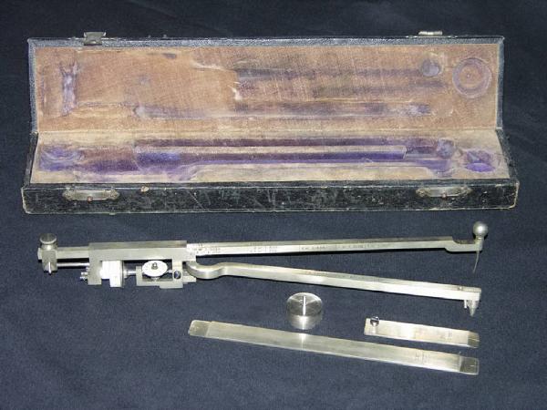 Lo strumento ricorda vagamente un compasso che si utilizza in posizione orizzontale anziché verticale. E' composto da due astine metalliche di lunghezza diversa. La più corta è incernierata sulla più lunga in un punto situato a circa un terzo della lunghezza di quest'ultima. Un meccanismo lega il movimento dell'asta corta - l'angolo di apertura - a un piccolo cilindro con scala graduata che consente di leggere la quantità desiderata. Lo strumento è custodito all'interno della sua scatola originale in legno ricoperta di finta pelle. L'interno è in velluto e sono contenuti alcuni accessori tra i quali delle astine di prolunga.