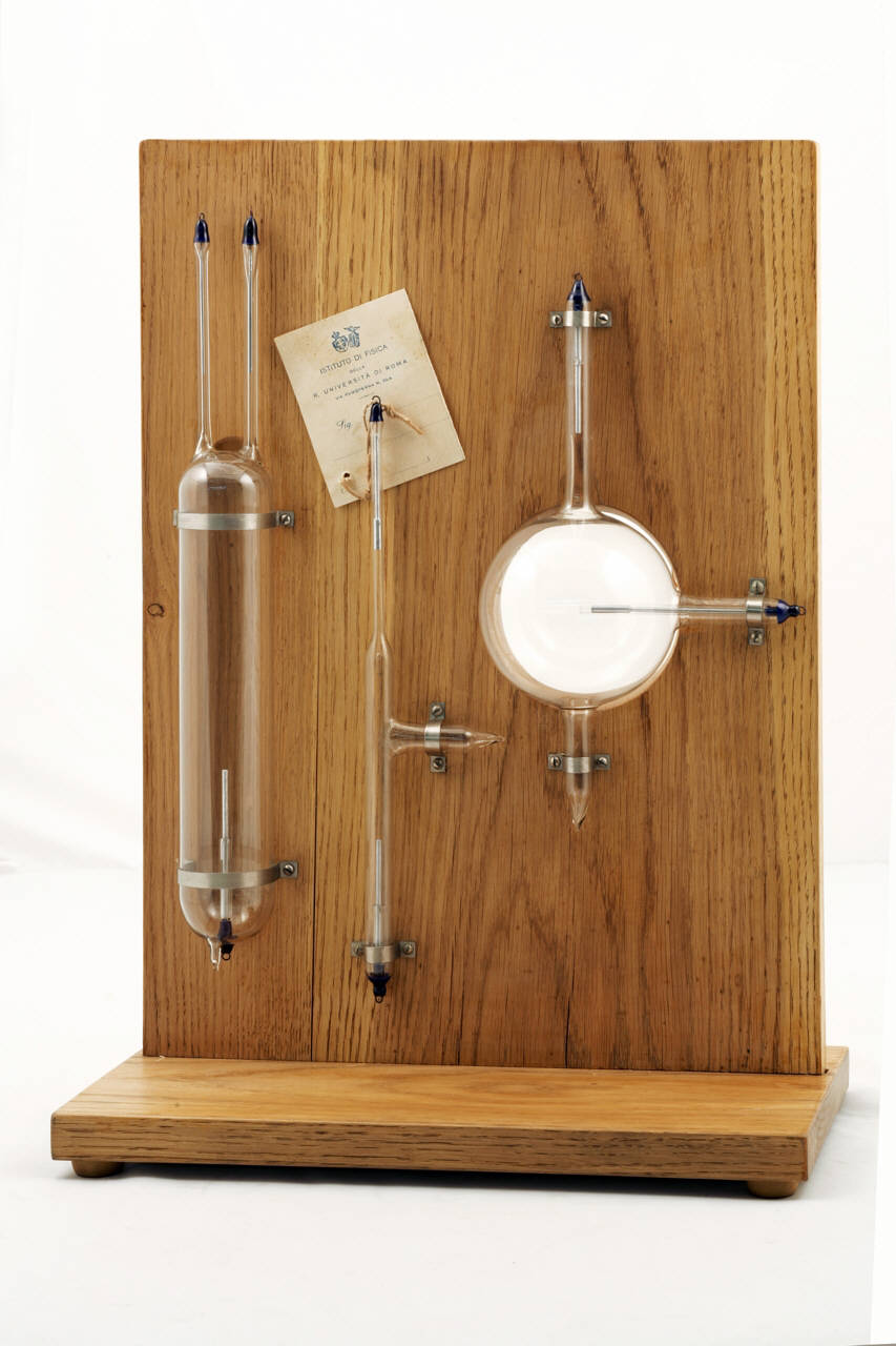 Il compendio è costituito da tre tubi in vetro di varia foggia e dimensione fissati su un pannello in legno di forma rettangolare posizionato verticalmente su una base anch'essa rettangolare e in legno, a formare una "T" rovesciata. All'interno dei tubi è ricavato il vuoto mentre alle estremità sono presenti i contatti elettrici degli elettrodi occorrenti alla generazione, all'interno del tubo, di un campo elettrico e di un fascio di ioni positivi accelerati. Questo fascio, attraverso uno spettroscopio, mostra l'effetto noto come Stark-Lo Surdo.\nL'astuccio parallelepipedo in legno del compendio, mostra superiormente una maniglia metallica cui sono legati una chiave e un cartellino tondo metallico con etichetta incollata in carta; inoltre sullo stesso lato c'è l'asola della serratura che blocca il coperchio posto frontalmente e incassato.