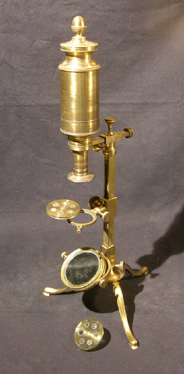 Strumento estremamente elegante realizzato completamente in ottone. La parte ottica di questo microscopio è formata da un cilindro collocato verticalmente e tenuto in posizione da un supporto ad asta che termina con tre piccole gambe richiudibili. Il cilindro, grazie a una piccola staffa orizzontale, è montato leggermente disassato rispetto al supporto in modo da avere il campo ottico al di sotto libero e poter collocare il materiale da analizzare. La parte superiore del tubo ottico è chiusa con un tappo; rimosso questo è possibile inserire nella apposita sede l'oculare e completare il dispositivo ottico. Sono forniti in dotazione cinque diversi oculari; ognuno di essi permetteva di ottenere un ingrandimento differente. Al di sotto dell'obiettivo del microscopio è posizionato un supporto ad anello che è mantenuto in posizione orizzontale grazie ad una staffa scorrevole sull'asta di supporto dello strumento. Su questo anello si potevano appoggiare quattro dischi distinti, in ottone e vetro, che erano forniti come dotazione accessoria; su ognuno di essi sono presenti sei diversi campioni già preparati e pronti per essere analizzati. Al di sotto uno specchietto inclinabile illuminatore consentiva di raccogliere e indirizzare opportunamente la luce sull'area di osservazione. Le varie parti mobili dello strumento sono governate grazie a piccole viti di fissaggio con manopola.\nLo strumento è fornito della sua scatola in legno originale; all'interno sono conservati alcuni accessori come i dischi dei preparati, un paio di vetrini, gli oculari e un foglio scritto a mano con l'elenco completo dei campioni forniti in dotazione.\nContiene un foglio scritto a mano con l'elenco dei vetrini disponibili.\nSulla scatola sono presenti due etichette metalliche; una riporta le scritte: "P.M. = I.C. / 3321". L'altra riporta: "DEPUTAZIONE PROVINC / 1837 / MILANO".