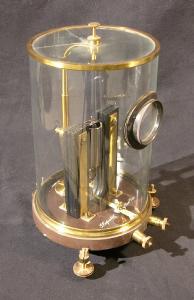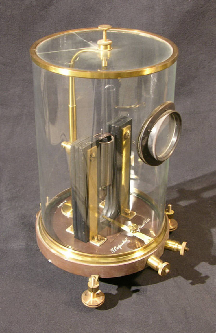 La base dello strumento è in legno e a sezione circolare. Poggia su tre viti calanti in ottone e ospita due morsetti per i collegamenti elettrici che sono posizionati nello spessore della base e disposti radialmente. Dalla base si innalzano verticalmente i poli di una calamita composta simmetrica rispetto al centro della base stessa e tenuti in posizione da piccole staffe in ottone. Al centro dei due elettromagneti è posizionata una bobina mobile sospesa per mezzo di un sottile filo sorretto da un'asta fissata alla base. Lo strumento è ricoperto da una campana cilindrica di vetro (due piccole crepe sono presenti nella parte superiore) nella quale è localizzata una finestra ottica per l'osservazione; da qui era possibile misurare lo spostamenteo dell'equipaggio mobile sotto l'effetto della corrente che veniva fatta passare nel cicrcuito consentendone la misurazione.