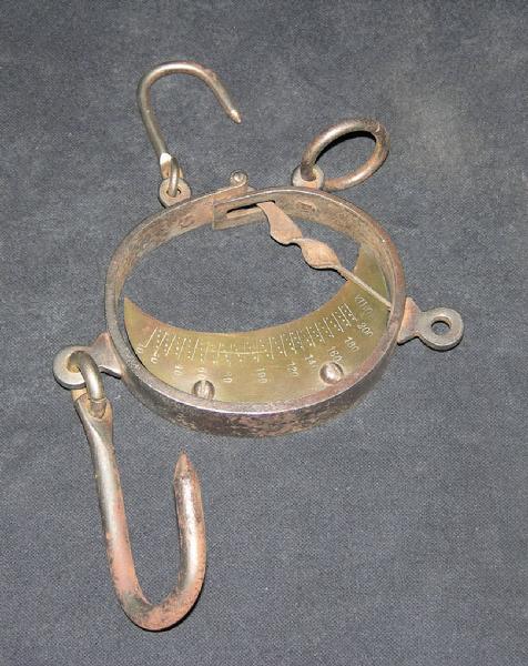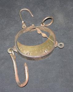Pesa a dinamometro composta da una lamina metallica curvata a formare un anello leggermente schiacciato (ellisse) con le due estremità parzialmente sovrapposte ma libere. Nell'estremità che rimane più esterna è incernierata una lancetta metallica che si infila in una fessura ricavata nell'altra estremità, che è adiacente alla prima, della lamina. La punta di questo indicatore può scorrere lungo una scala graduata incisa su una placchetta metallica a forma di falce di luna fissata sulla parete interna opposta. Sulla parete esterna della lamina sono fissati i ganci per la sospensione della pesa e quelli per appendere l'oggetto da misurare. La scala consente misure fra 0 e 200 chilogrammi con precisione di due chili.