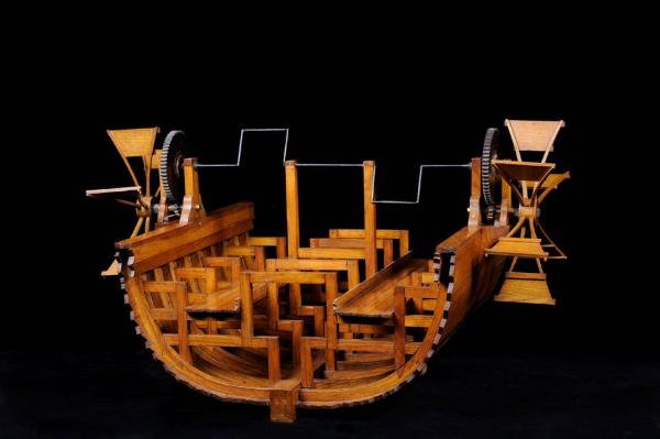Il modello rappresenta una sezione trasversale di scafo di imbarcazione. L'interno è occupato da un'intelaiatura che sorregge una barra di trasmissione collegata a due ruote dentate ai due lati dello scafo. Le ruote dentate mettono in movimento due ruote a sei pale.