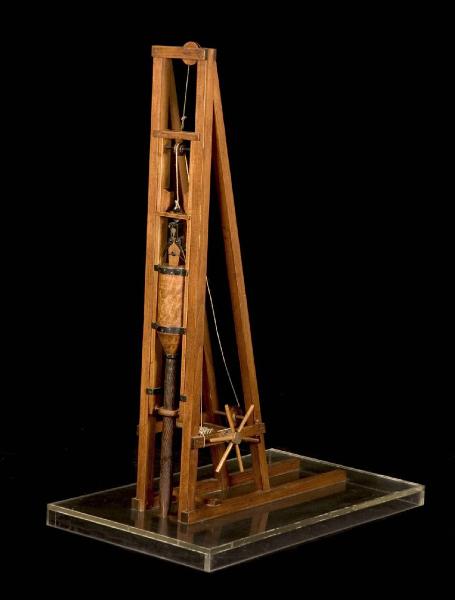 Il modello rappresenta una battipalo costituito da un grande maglio cilindrico che scorre in una struttura di legno verticale. L'estremità superiore del maglio termina con una molletta metallica che lo aggancia a una guida collegata a un argano. Sotto il maglio si trova un tronco tenuto in posizione da un anello. L'argano è azionato da una ruota dentata posizionata nella parte inferiore destra. La ruota ha un dente di arresto che le impedisce di girare in senso contrario.