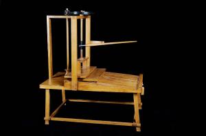 Il modello rappresenta un torchio da stampa. Il carrello che porta i caratteri da stampa e su cui poggiano i fogli si muove su due ruote che scorrono lungo un piano inclinato. Il torchio vero e proprio è costituito da un'albero verticale mosso da una barra. Nell'estremità inferiore una vite senza fine lo collega alla piastra che esercita la pressione sui fogli e sui caratteri. Nell'estremità superiore dell'albero c'è una ruota dentata che si collega al pignone di un secondo albero, a sua volta terminante con una puleggia a cui è fissata una corda collegata al carrello mobile portafogli: la tensione del carrello sul piano inclinato è assicurata da un peso