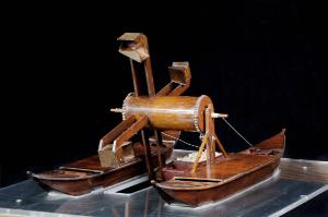Il modello rappresenta una draga posta tra due imbarcazioni. è formata da un tamburo cilindrico su cui sono montati quattro bracci terminanti con pale draganti. Sulle pale è anche un piccolo scivolo. Il tamburo termina ai lati con due ruote dentate che ingranano due ruote più piccole con manovella. \nTra le due imbarcazioni c'è una terza barca indipendente, che nel centro ha una cassa di raccolta del materiale.