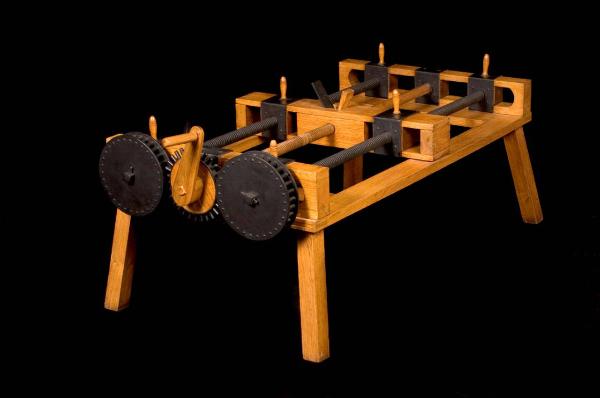 Il modello è' costituito da una struttura in legno sulla quale sono montate tre lunghe viti. Le due viti laterali sono in ferro mentre quella centrale, da filettare, è in legno. Una struttura trasversale scorre lungo le tre viti attraverso dei fori, guidata da due madreviti laterali. In corrispondenza della vite centrale è infilata una lama che si incunea in un apposito alloggiamento obliquo. Le due viti laterali sono collegate tramite due ruote a pignone a una ruota dentata centrale con manovella
