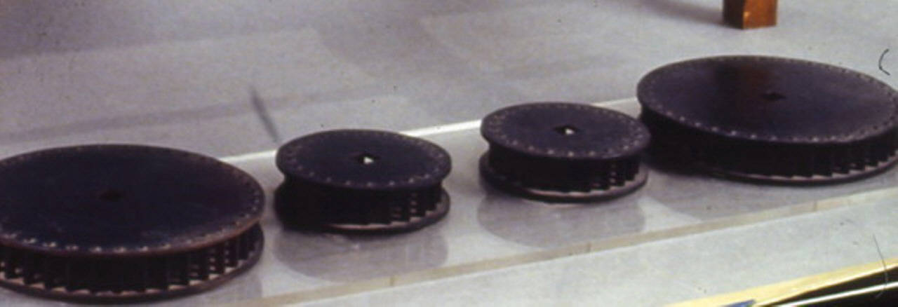 Quattro ingranaggi a pignone di due misure diversi sono incollati su una base di plexiglass