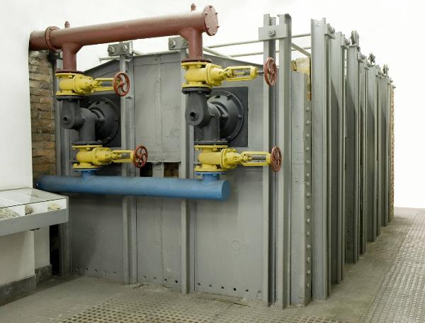Forno a riverbero, in acciaio dipinto di grigio con interno in materiale refrattario.\nIl forno è dotato di sei bocche di carico (tre per lato lungo), una bocca di colata (su uno dei lati corti) e tubature del bruciatore e relativi meccanismi (sull'altro lato corto). Le sei bocche di carico sono di forma rettangolare, della dimensione di ca. 20x20 cm; di tre sono visibili anche le porte richiudibili tramite meccanismi a carrucola e i mecanismi stessi. La bocca di colata è di forma circolare, della diamentro di ca 30 cm è visibile solo dall'interno. \nIl bruciatore (non presente) era sistemato a fianco del forno, come dimostrano le tubature: le fiamme non vengono a contatto col metallo, che viene invece investito direttamente dai gas caldi e dal riverbero del calore (irraggiamento) contro le pareti del forno sagomate opportunamente. I colori delle tubature e dei meccanismi rispettano la regolamentazione dell'epoca: tubi rossi per il passaggio di fluidi caldi, tubi blu per il passaggio di fluidi freddi, meccanismi (volanti) rossi per la movimentazione manuale.\nIl rivestimento interno in materiale refrattario costitutisce anche il recipiente per il metallo fuso.