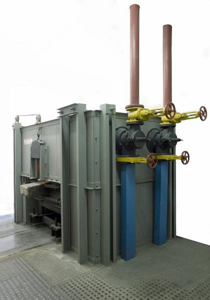 Forno a riverbero con coppella, in acciaio dipinto di grigio con interno in materiali refrattario.\nIl forno è dotato di una bocca di carico (sul lato lungo), coppella e tubature del bruciatore con relativi meccanismi (sull'altro lato corto). La bocca di carico è di forma rettangolare, della dimensione di ca. 20x20 cm; è visibile anche la porta richiudibile tramite meccanismi a carrucola e i mecanismi stessi. La coppella, una grossa siviera metallica rivestita in materiale refrattario, è sistemata sotto la volta del forno a riverbero e fa da basa per il forno stesso. Il bruciatore (non presente) era sistemato a fianco del forno, come dimostrano le tubature: le fiamme non vengono a contatto col metallo, che viene invece investito direttamente dai gas caldi e dal riverbero del calore (irraggiamento) contro le pareti del forno sagomate opportunamente. I colori delle tubature e dei meccanismi rispettano la regolamentazione dell'epoca: tubi rossi per il passaggio di fluidi caldi, tubi blu per il passaggio di fluidi freddi, meccanismi (volanti) rossi per la movimentazione manuale.\nIl rivestimento interno è in materiale refrattario.