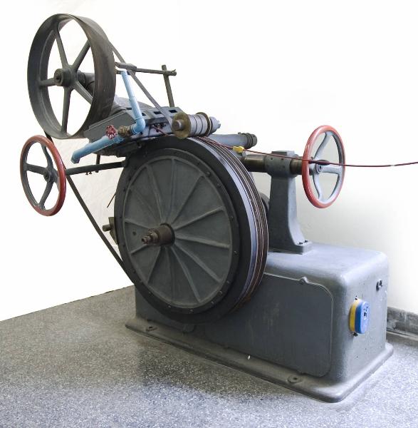 Macchina per la colata continua, prima parte del "Sistema CCR" (Continuous Casting and Rolling - Colata continua in conchiglia chiusa e laminazione diretta). La macchina è composta da una "ruota di biciletta modificata", una vaschetta per l'alimentazione del piombo, una puleggia, un sistema di raffreddamento ad acqua e un motore elettrico.\nLa ruota è composta da un cerchione di bicicletta in rame (diametro ca. ) lungo la cui circonferenza è saldata una barra profilata a U in acciaio. Per metà della circonferenza (parte inferiore), la barra a U è chiusa da un sottile nastro in acciaio a formare una cavità . Tale cavità (parte superiore della circonferenza) è in comunicazione con la vaschetta per l'alimentazione del piombo tramite un sottile canale. Il nastro (lungo ca 300 cm, largo 5 cm e spesso 0,5 cm) ha le estremità saldate insieme a formare un arco di circa 180°, e viene tenuto in posizione e in tensione da una puleggia. Il sistema di raffreddamento a getto d'acqua è a diretto contatto con il fondo e il lato della barra scanalata. Il motore elettrico è collocato in modo da poter trasmettere il moto all'albero della ruota attraverso una cinghia. Le parti suscettibili a movimentazione manuale (volanti) sono colorate di rosso, secondo quanto indicato dalla regolamentazione dell'epoca.