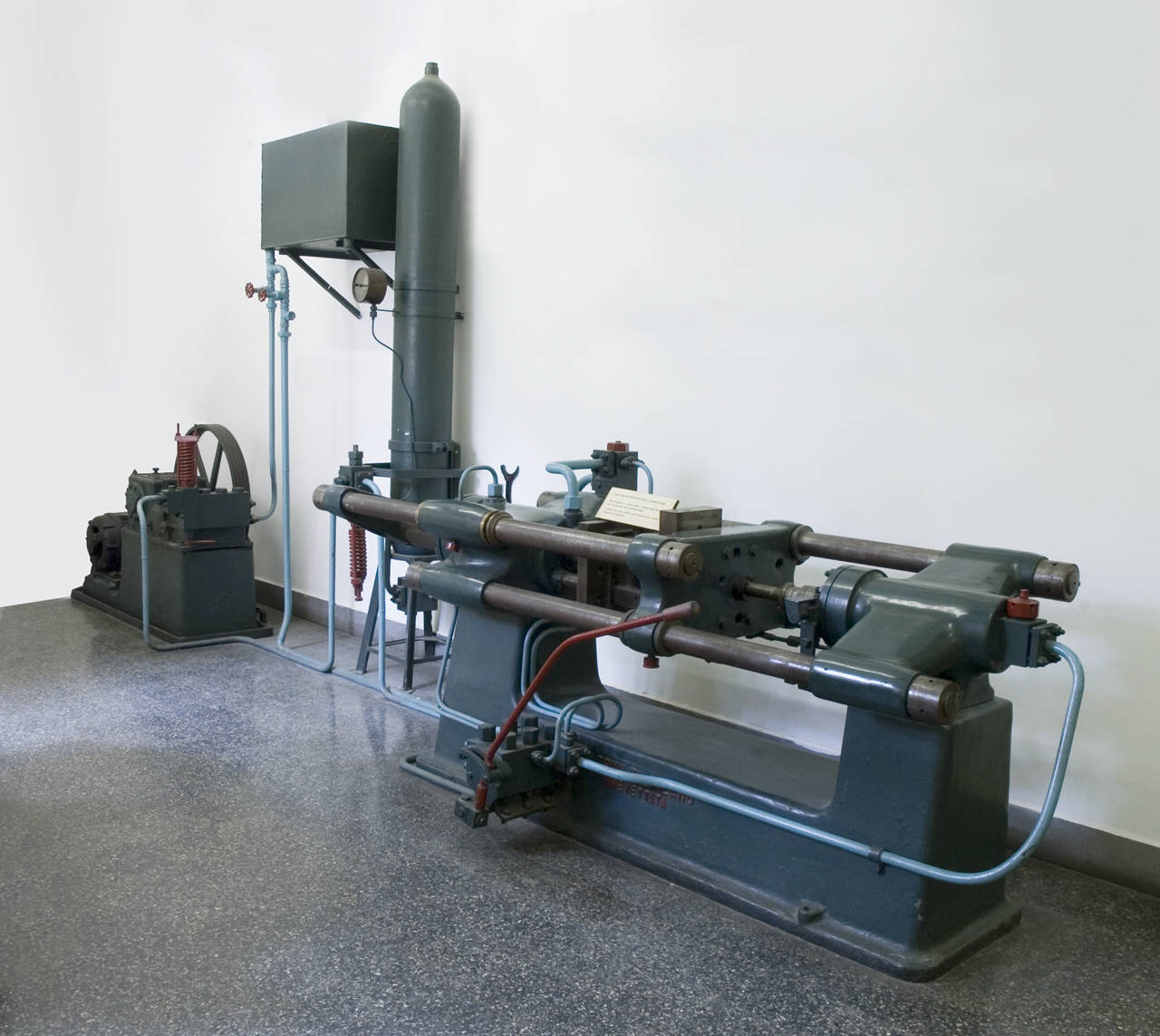 Come tutte le macchine di questo genere, la macchina per pressofusione in esame è composta di una camera atta a contenere il metallo liquido (camera fredda), diverse forme metalliche permanenti (conchiglie, non presenti) montate su piani (uno fisso e uno mobile) e un sistema di iniezione del metallo dalla camera fredda alla conchiglia comandato da una leva (che comanda anche l'apertura/chiusura della conchiglia). \nLa camera fredda è costituita da un cilindro orizzontale, chiuso su un lato da un pistone mobile; il ciclindro è dotato di un'apertura per l'ingresso del metallo liquido sulla parte superiore e di un'apertura per il passaggio del metallo liquido (canale di colata) dal ciclindro alla conchiglia sulla parte opposta al pistone mobile. \nLa conchiglia, in acciaio per utensili, è composta di due valve e riproduce in negativo la forma del pezzo da realizzare. La macchina è dotata di un sistema per l'estrazione del getto dalla conchiglia: in particolare, sulla macchina è montato un cavalletto con candela e cremagliera che permette di far funzionare gli estrattori frontali dei getti; le estrazioni laterali e superiori si ottengono usufrunedo della corsa del piano porta stampo mobile. \n \nCorredano la macchina una pompa idraulica, un accumulatore idropneumatico e un forno fusorio elettrico a resistenza con cabina di comando. \n\nLa pompa è l'organo che alimenta il circuito idraulico della macchina. Il corpo è in ghisa in un solo pezzo. Il gruppo delle valvole a compressione, anch'esso in ghisa, è ricavato da un solo pezzo, forgiato e scavato dal pieno. Le valvole e le loro sedi, in acciaio inox, sono smontabili. I tre pistoni sono in acciaio temprato rettificato. L'albero a gomito, in acciaio, è ricavato dal pieno, rettificatoe emontato su cuscinetti a sfera. Le bielle hanno teste in bronzo e piede sferico con guida rettificata. L'intero complesso è montato su basamento in ghisa con piazola mobile e tendicinghia per motore. La pompa è corredata da un cassone in lamiera con filtro e valvola di sicurezza.\n\nL'accumulatore è il polmone dal quale la macchina attinge la potenza necessaria al funzionamento a pressione pressoché costante. E' costituito da una bombola in acciaio al carbonio, supporto in ferro, rubinetto separatore, gruppo automatico idraulico di minima pressione con rubinetto generale, prese per il manometro e per il caricamento dell'aria. \n\nIl forno fusorio elettrico a resistenza è di forma cilindrica con chiusura manuale a soffietto. E' composto da un crogiolo, termoisolato, in ghisa speciale con rivestimento in lamiera; le parti suscettibili a movimentazione manuale sono colorate di rosso, secondo quanto indicato dalla regolamentazione dell'epoca. La cabina coi comandi, contenente pirometri, termocoppie e regolatori automatici di temperatura, reca una targa con l'iscrizione "FORNI ELETTRICI" - A.& F. f.lli CUFFIA - MILANO", le etichette "APERTO", "CHIUSO" e "NON USARE IL COMMUTATORE SOTTO CARICO", le iscrizioni "PIROMETRO BREVETTATO" sull'indicatore dello strumento. \n\nI colori delle tubature e dei meccanismi della macchina e dei suoi annessi rispettano la regolamentazione dell'epoca: tubi rossi per il passaggio di fluidi caldi, tubi blu per il passaggio di fluidi freddi, meccanismi rossi per la movimentazione manuale.