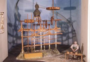 Questa riproduzione della macchina a vapore di G.Branca è collocata all'interno di un diorama ed è costituito da una parte termica, organi di trasmissione e un sistema di aste e pestelli.\nLa parte termica è costituita da una caldaia in bronzo dalle fattezze umane. L'uomo tiene in bocca una cannuccia che permetteva di convogliare il getto di vapore uscente da un ugello posto sulla caldaia.\nIn prossimità dell'estremità libera della cannuccia è posizionata una ruota a pale, con asse verticale.\nAll'asse è fissato un sistema di ruote a pioli che trasferisce il moto ad un albero a camme cilindrico.\nA questo sono collegate due aste verticali, alla base delle quali sono collocati due pestelli liberi di muoversi all'interno di due mortai.\nNel diorama è anche collocata la riproduzione di un uomo al tavolo da lavoro.\nE' inoltre presente un motorino che permette di azionare il modello e simulare il funzionamento della macchina.