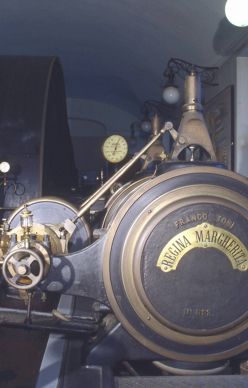 La macchina a vapore di tipo compound è costituita da una parte termica, organi di trasmissione e un volano. \nLa parte termica è composta da una caldaia (attualmente non presente), due cilindri paralleli orizzontali, uno di dimensioni inferiori (ad alta pressione), l'altro di dimensioni superiori (a bassa pressione) e da un condensatore separato, del tipo a miscela (attualmente non presente). \nL'immissione del vapore è regolata da valvole di distribuzione a molle Lentz-Tosi, presenti sui cilindri, e controllate da un regolatore di giri Lentz-Tosi, montato sul cilindro ad alta pressione. In prossimità dei cilindri sono inoltre presenti due manometri sistema Bourdon, un indicatore di vuoto sistema Bourdon, prese di vapore a comando manuale per l'apertura e la chiusura. \nAll'interno di ogni cilindro si trova uno stantuffo. Le aste degli stantuffi terminano, all'esterno dei cilindri, con due teste a croce che permettono il collegamento a due bielle. Tramite due manovelle, le bielle sono collegate ad un grande volano posto in mezzo ad esse.\nIl volano è collegato, tramite una cinghia ad una puleggia, del tipo mossa, e quindi ai dispositivi elettrici.