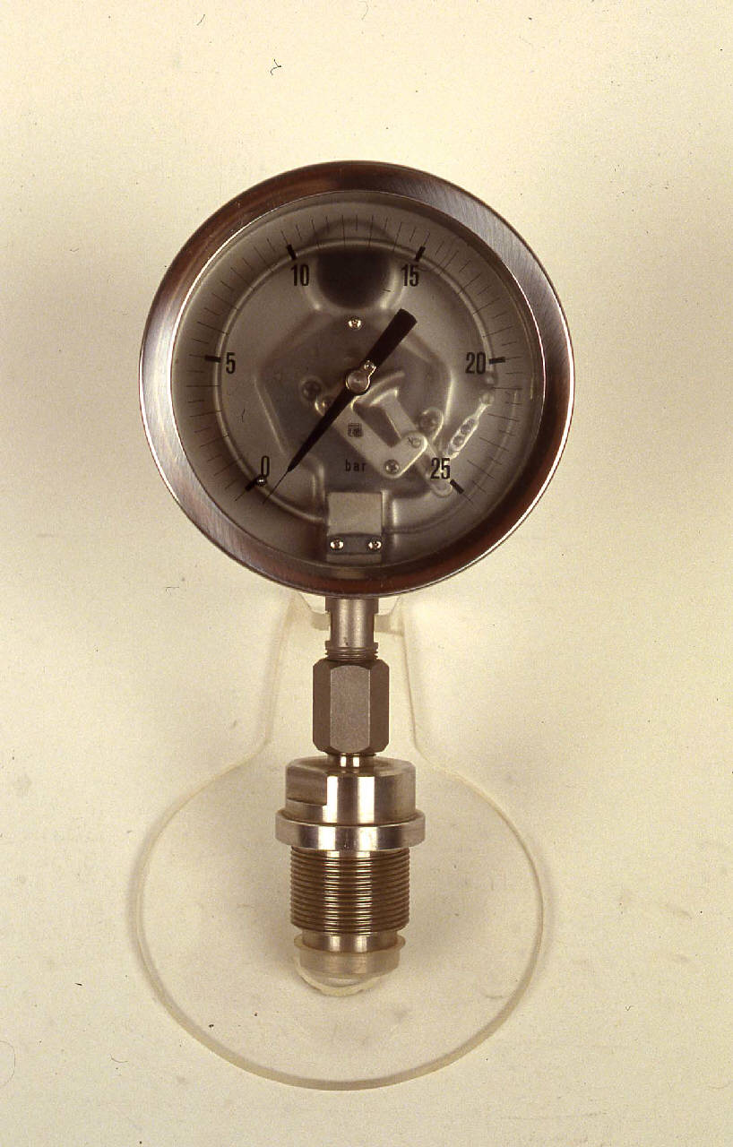 Manometro per impianto industriale dalla forma tipicamente circolare con scala graduata compresa tra 0 e 25 bar, suddivisioni ogni 0,5 e indicazioni numeriche ogni 5 unità. La scala graduata è stampata su vetro smerigliato. Attraverso il vetro è possibile vedere il meccanismo di funzionamento sottostante. Nella parte inferiore dello strumento è presente il sistema per il collegamento all'impianto da misurare costituito da una serie di connettori di forma cilindrica alla cui estremità inferiore è inserita la membrana di separazione. Il manometro è attualmente fissato ad una base di plastica trasparente a soli scopi espositivi.