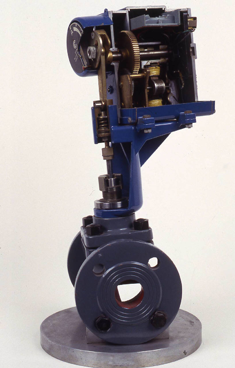 Lo strumento ha una funzione didattico esplicativa: alcune delle sue parti sono sezionate per consentire la visione del meccanismo di funzionamento interno. Nella parte inferiore è presente una tratta di condotta di forma cilindrica con alle estremità due flange per l'inserimento nel circuito principale. Nella parte centrale è posizionata la valvola di regolazione. La sua posizione veniva regolata grazie a un motore montato al di sopra. Questo è contenuto in una struttura metallica di forma rettangolare che ad un'estremità termina con un tratto a sezione circolare entro cui è posizionato assialmente il controllo della valvola. Il motore elettrico è chiaramente visibile ed è possibile osservare la bobina di induzione magnetica, alcune ruote dentate per la regolazione della posizione della valvola oltre ad alcune componenti elettroniche. Sulla cassa del motore di regolazione è avvitata una piccola lastra metallica incisa sulla quale sono riportati i dati essenziali di funzionamento della valvola. Nella parte superiore due fori con guarnizioni in gomma permettevano il passaggio dei cavi per l'alimentazione elettrica. Tutto lo strumento poggia su una base circolare in metallo realizzata per motivi espositivi.