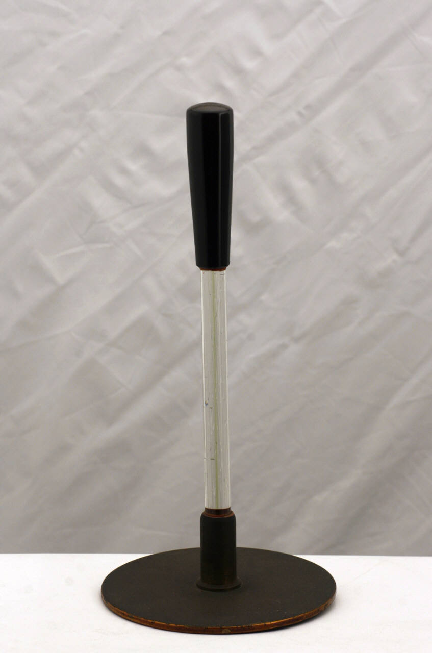 Questo strumento è costituito da un disco conduttore in metallo, detto scudo, munito di un manico isolante in vetro ed ebanite.\nE' mancante l'altra parte dello strumento detto schiacciata.