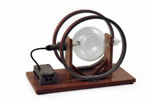 Questo apparato è montato su una base in legno ed è costituito da due parti: un tubo a raggio filiforme connesso ad una scatola di collegamento fissata sulla base stessa, e due bobine di Helmoltz per la produzione di un campo magnetico omogeneo per la determinazione di e/m. Il tubo è inserito in due fori passanti, rivestiti in feltro, presenti su due sostegni verticali in legno fissati alla base e le bobine sono fissate con delle piastrine metalliche alla stessa base.\nIl tubo a raggio filiforme è costituito da un tubo sferico in vetro, riempito di idrogeno, con cannone elettronico costituito da catodo ad ossidi riscaldato indirettamente, cilindro di Wehnelt e anodo. La pressione all'interno del tubo è regolata in modo tale che il raggio elettronico prodotto dal sistema resti sotto forma di nitido fascio per tutta la sua lunghezza (con tensione anodica di 200-300V). E' inoltre presente una coppia di placche per la deviazione elettrostatica del raggio. I collegamenti degli elettrodi, del cilindro di Wehnelt , del filamento e delle placche di deviazione sono raccolti nello zoccolo a 6 poli del tubo. Un cavo multiplo con spina a 6 poli, connette il tubo alla scatola di collegamento che contiene anche le resistenze di protezione per la limitazione della corrente d'emissione. \nSulla scatola di collegamento sono inserite 5 coppie di boccole per i collegamenti elettrici. Una per il catodo, una per il riscaldamento del filamento, una per il cilindro di Wehnelt, una per l'anodo, una per le placche di deviazione.\nLe bobine di Helmoltz sono costituite da due singole bobine ognuna di 130 spire, avvolte su due anelli di raggio 150mm e posti parallelamente, alla distanza di 150mm. Esse sono caricabili fino a ca. 5A. Sotto alla base in legno sono fissati due fili elettrici di collegamento.
