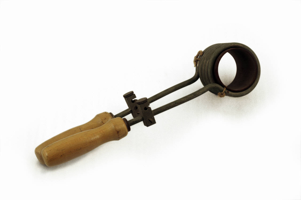 Questa bobina è costituita da un grosso filo in rame, di 8mm di spessore, avvolto in 5 spire di ca. 65mm di diametro. La risultante bobina è rivestita internamente con un manicotto isolante e le sue estremità sono provviste di manici in legno. Per chiudere il circuito elettrico, al di sopra dei manici sono avvitati dei morsetti. In uno dei due è fissato un chiodo (l'altro è mancante).