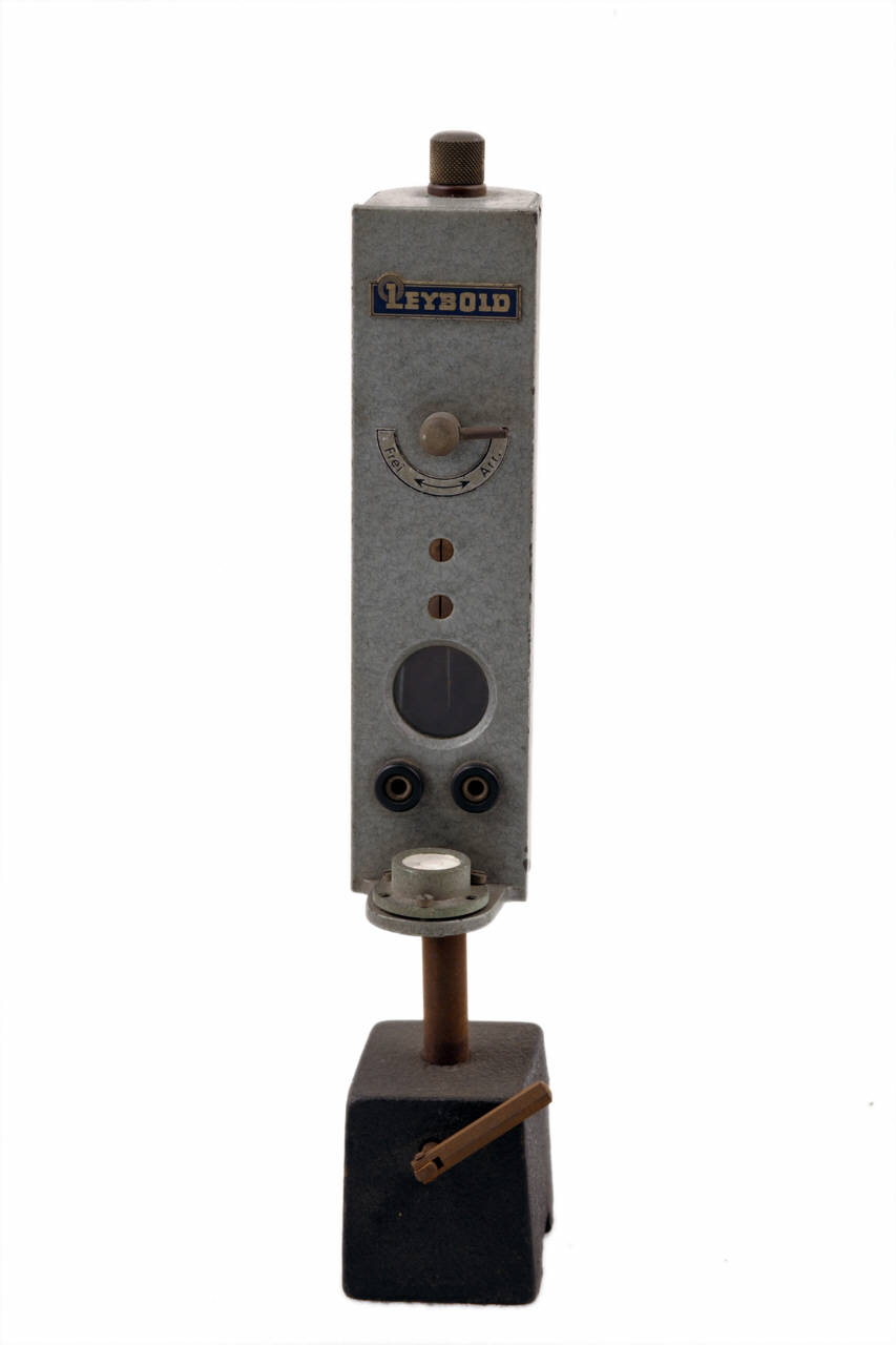 Questo galvanometro a specchio è a sistema magnetico a nucleo interno con sospensione costituita da un nastro metallico rigido.\nIl dispositivo è racchiuso in una custodia in metallo con una finestrella in vetro all'altezza dello specchietto concavo e due boccole da 4mm per i collegamenti elettrici.\nUna leva d'arresto, regolabile dall'esterno, permette il bloccaggio e lo sbloccaggio della sospensione interna.\nSulla custodia è inserita una livella a bolla per il corretto posizionamento in orizzontale dello strumento.\nInferiormente fuoriesce un'asta inserita in una base d'appoggio trapezoidale.