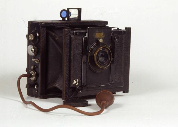 Apparecchio fotografico in metallo ricoperto in pelle con soffietto in pelle. Lateralmente è presente una maniglia in cuoio e pelle per il trasporto e l'impugnatura.\nIl soffietto è ripiegato all'interno della macchina e può essere estratto con facilità tirando verso l'esterno tutta la parete frontale.\nUna volta estratto, il soffietto è sorretto e mantenuto in posizione da due coppie di leve metalliche (tiranti).\nDavanti al soffietto, sulla parete frontale, è inserito, su una lastra in metallo rettangolare, l'obiettivo con movimento elicoidale. La posizione del porta obiettivo è regolabile sia in orizzontale che in verticale con due viti per il fissaggio nella posizione desiderata.\nLa messa a fuoco dell'immagine avviene ruotando una leva posta direttamente sull'obiettivo (distanze di ripresa da 2m all'infinito).\nL'obiettivo è protetto da un coperchio in tela ricoperta in pelle legato con un cordino al resto dell'apparecchio.\nL'apertura del diaframma veniva regolata ruotando una ghiera posta sull'obiettivo in corrispondenza del diaframma stesso (indicazioni numeriche da 4,6 a 192).\nDalla parte opposta dell'obiettivo è inserito il porta lastra (formato 9x12cm) estraibile. Nel porta lastra è inserito un vetro smerigliato, utilizzato per l'inquadratura e la messa a fuoco, protetto da un paraluce apribile in pelle.\nIl porta lastra può essere sfilato lateralmente per caricare la lastra fotografica.\nL'apertura del porta lastra permette la visione interna dell'apparecchio. Sono visibili l'otturatore a tendina e la camera oscura.\nI tempi dell'otturatore, a carica automatica, sono regolabili attraverso una rotella posta lateralmente sul dorso dell'apparecchio, in prossimità dell'otturatore.\nEra possibile comandare l'otturatore sia in maniera manuale attraverso un meccanismo a molla con comando esterno posizionato sul fianco dell'apparecchio, che tramite un comando pneumatico a peretta collegabile ad un apposito dispositivo collocato sempre sul fianco.\nLateralmente si trova anche un contafotogrammi a comando manuale.\nSuperiormente è inserito un mirino Newtoniano costituito da due parti: una piccola lente azzurra e una lente convergente rettangolare con mirino inciso.\nSotto all'apparecchio è presente un foro filettato per il posizionamento eventuale su un cavalletto.
