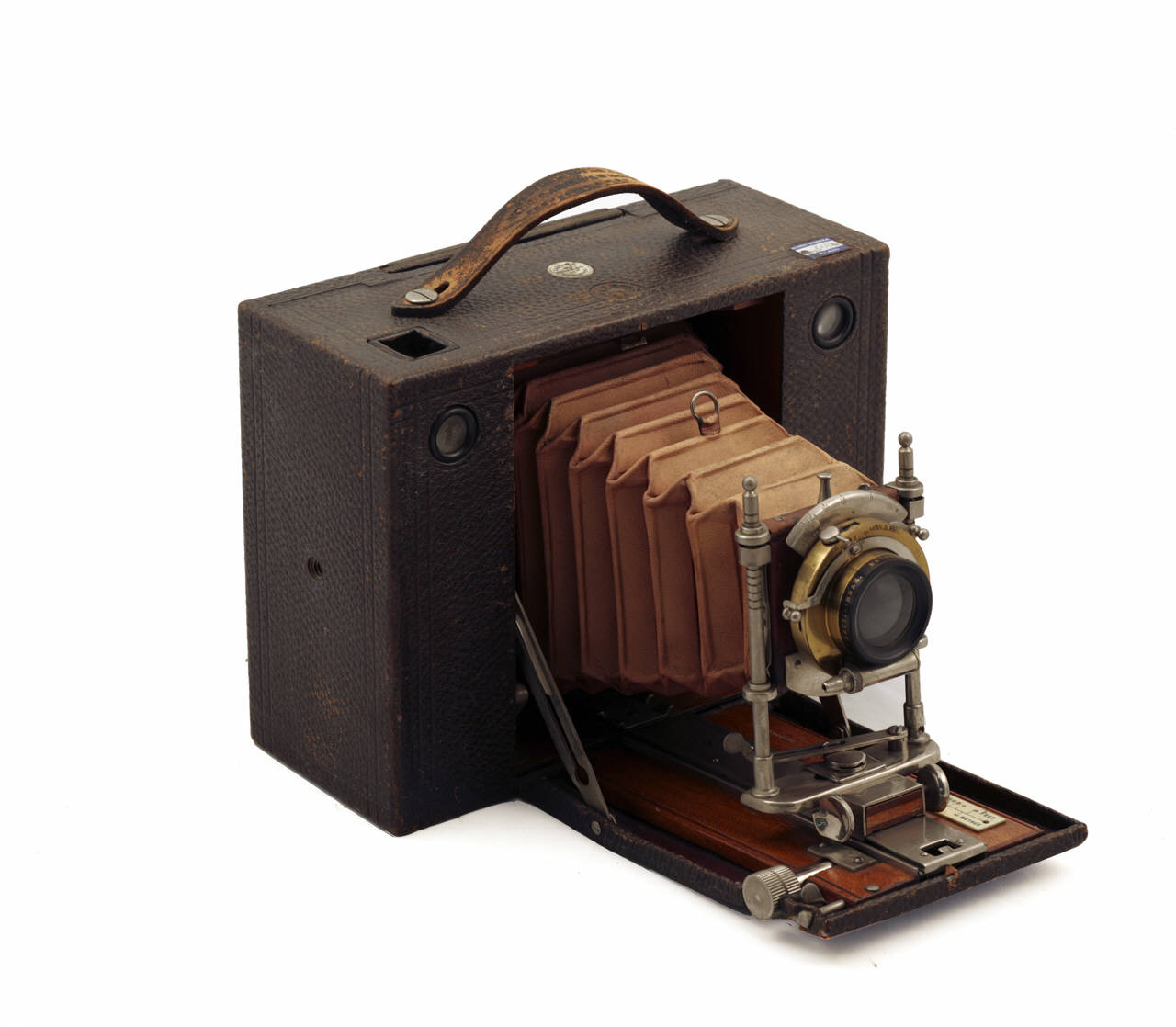 Questo apparecchio fotografico, costruito in legno ricoperto in pelle, ha forma parallelepipeda e maniglia in cuoio per il trasporto.\nSono presenti due mirini a riflessione per pose in verticale e in orizzontale.\nSulla parete frontale, tra le due lenti dei mirini, è inserito uno sportello apribile incernierato nella parte bassa.\nPremendo sul pulsante di sblocco posto superiormente, lo sportello si apre ed è possibile estrarre il soffietto in pelle marrone chiaro, libero di scorrere su una guida metallica posizionata su una tavoletta in legno all'interno dello sportello stesso.\nLo sportello è mantenuto aperto da due tiranti in metallo.\nPer muovere il soffietto occorre tenere premuti due pulsanti di sblocco posti sul telaio e ruotare una rotella posta lateralmente sulla guida.\nLa lettura della distanza di ripresa può avvenire rispetto ad una scala graduata fissata sull'interno dello sportello che riporta le distanze 2, 3, 5, 8, 15, 30 m e 6, 8, 10, 12, 15, 25, 50, 100ft.\nIl soffietto termina con un telaio in metallo, parzialmente ricoperto in pelle, sul quale è posizionato il porta obiettivo.\nL'obiettivo può scorrere verticalmente.\nAll'interno dell'obiettivo sono inseriti un diaframma a iride ed un otturatore centrale.\nSopra all'obiettivo è possibile selezionare, mediante una levetta, l'apertura del diaframma (indicazioni numeriche da 4 a 128 forse in unità U.S.). \nSopra all'obiettivo, un'altra levetta permette di selezionare tre posizoni per la modalità di scatto dell'otturatore: B, I, T. B e T corrispondono a tempi di posa in cui l'otturatore resta aperto fino a che non si rilasci lo scatto o non si scatti nuovamente, I corrisponde allo scatto istantaneo.\nLa carica dell'otturatore avviene mediante una levetta posizionata sull'obiettivo, in corrispondenza dell'otturatore, mentre lo scatto avviene o tramite un'altra levetta collocata dal lato opposto dell'obiettivo oppure mediante uno scatto flessibile da inserire nell'apposito dispositivo pneumatico situato sotto all'obiettivo.\nSulla parete dell'apparecchio opposta all'obiettivo è inserito un vetro smerigliato con cornice in legno (formato 6,5x12cm) estraibile, utilizzato per l'inquadratura e la messa a fuoco.\nIl porta lastra può essere sfilato superiormente per caricare la lastra fotografica.\nSotto lo sportello e sotto all'apparecchio sono presenti due fori filettati per il posizionamento eventuale su un cavalletto.