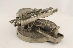 La macchina è completamente in metallo, ad esclusione del rivestimento in gomma del rullo e dell'indice lineare. Nella base di forma circolare è innestato il binario per lo scorrimento del carrello; sia la base che il binario sono decorati con volute a rilievo. Gli 84 caratteri sono montati sulla barra portacaratteri, libera di scorrere entro la guida ortogonale al carrello portarullo. La barra portacaratteri è dotata inoltre di una leva per la selezione delle maiuscole e di un'impugnatura per la selezione dei segni lungo l'indice lineare. L'indice è posto parallelamente alla barra, fissato sul supporto del braccio meccanico, e presenta delle scanalature in corrispondenza di ogni carattere. Due leve si trovano sul lato sinistro del carrello. Un campanello per l'avvertimento di fine riga è montato sul retro del braccio.