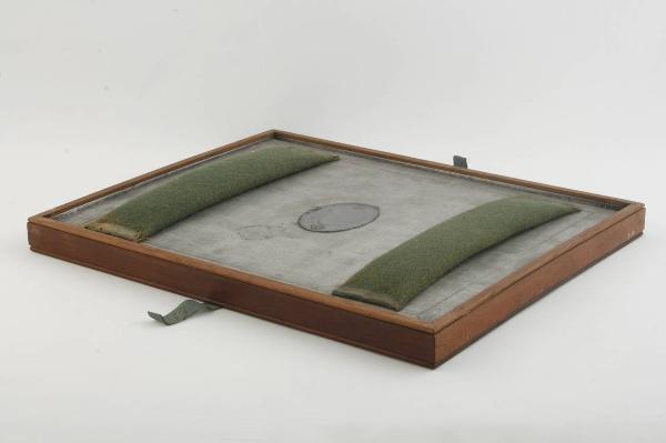 Vaschetta rettangolare in legno, rivestita internamente con una lamina in metallo. E' accessoriata con una tavola in legno, completamente rivestita da una lamina di metallo; sul lato superiore della tavola sono poste due maniglie in panno verde imbottito.