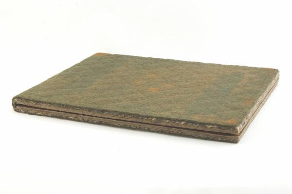 Piano di stampa pieghevole in cartone pressato; un lato del piano è rivestito da panno verde.