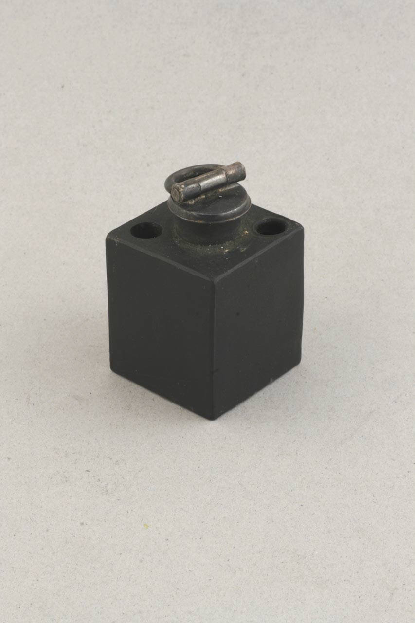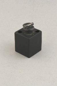 Vasetto in ceramica di colore scuro e a sezione quadrata. Il tappo è in argento; accanto alla bocca del vasetto si trovano due fori, posizionati in linea diagonale.