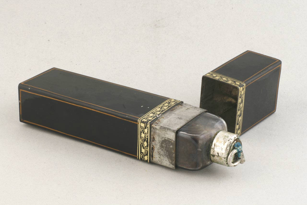 Bottiglia in vetro con tappo in argento, custodita in un astuccio metallico, a base rettangolare, laccato di nero.